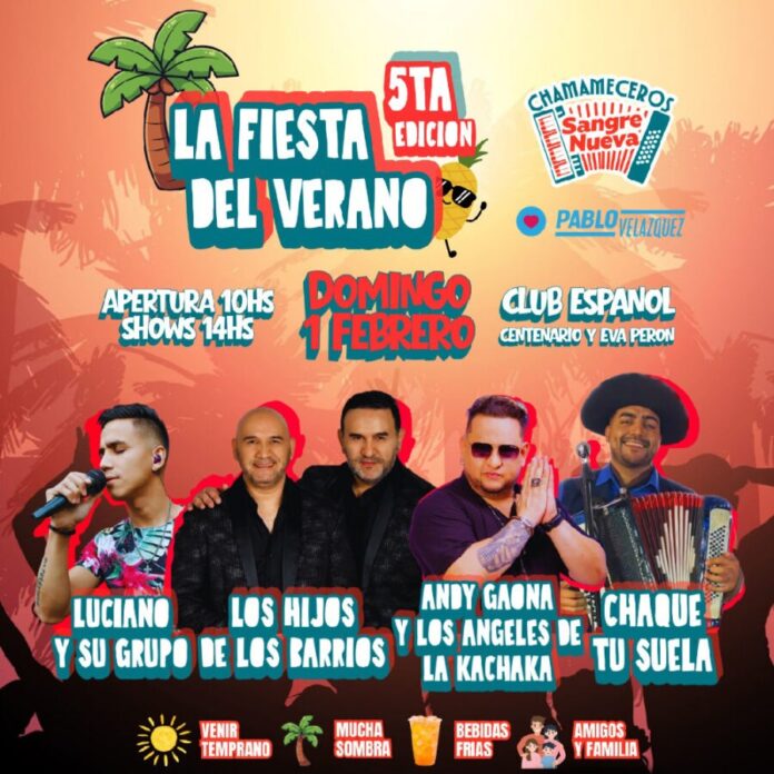 La 5° Fiesta del Verano se realizará el domingo 1 de febrero en el Club Español de Posadas, con apertura de puertas a las 10:00 horas y el inicio de los shows en vivo desde las 14:00. Durante toda la jornada, el público podrá disfrutar de un clima festivo marcado por el ritmo, la alegría y el espíritu veraniego.